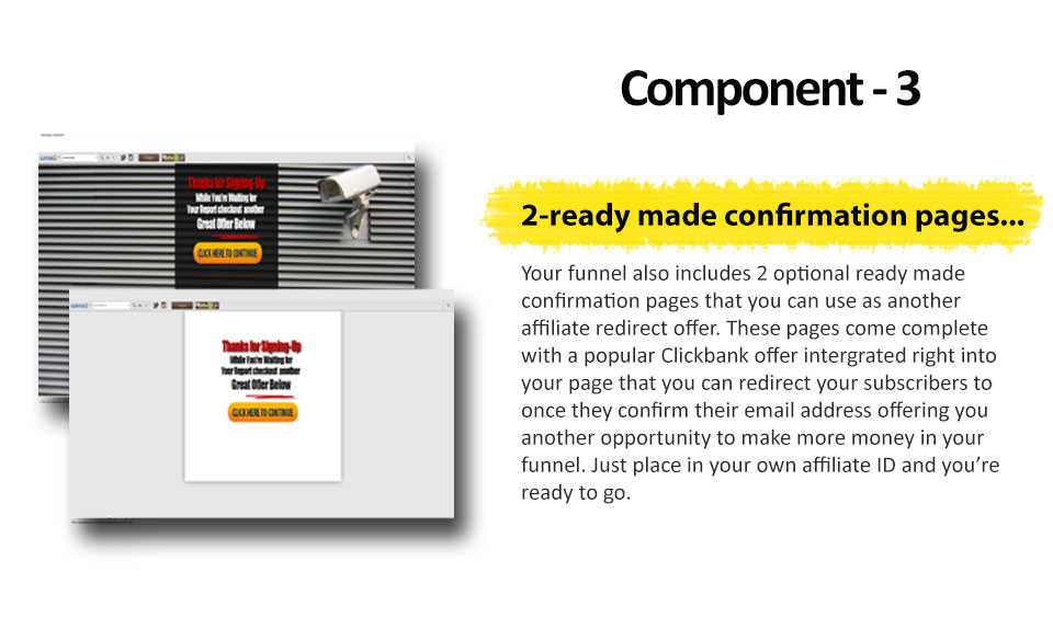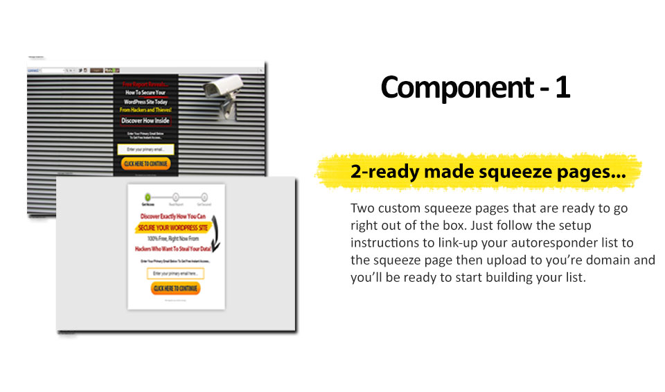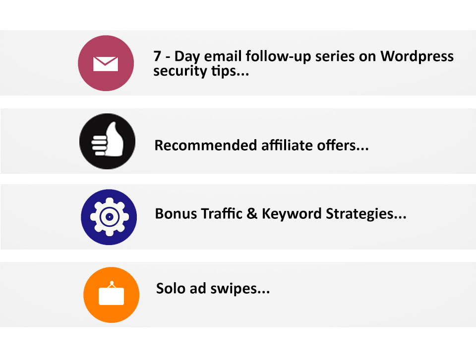 ![]() Fellow Marketer, Recently, many brute force attacks on Joomla and Wordpress sites have been happening, you may have have heard about this as well? With Wordpress making up over 22% of the websites on the web and delivering over 500,000 new posts per day Wordpress security has become vitally important for each of us who use Wordpress as our primary content management system. Each and every day Hackers continue to break in and steal your content, your identity and work to destroy all that you've worked so hard to create. Today you can take advantage of the huge popularity of Wordpress by picking-up your own done for you sales funnel featuring Wordpress Security that you can use to build a huge list of Wordpress subscribers that you can continue to market to over and over again. This is a completely done for you sales funnel kit, including two squeeze pages, two automatic redirect and confirmation pages, an exit splash script as well as a 7-day follow-up email series equipped with integrated affiliate links so you can continue marketing to your suscribers over and over, see more details below. Pick-up this sales funnel today and watch your subscibers list grow while you collect the more sales in the backend with this completely done for you sales funnel. ![]() So