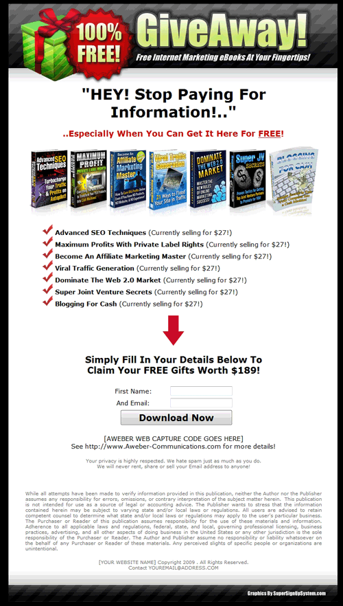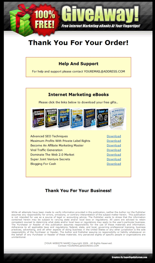 Not only do they encourage a sign up with every visitor, but you have a chance to make an up-sell early on that is directly related to the original free offer. Putting this together yourself can take some time, but why start from scratch when I've already done it for you?