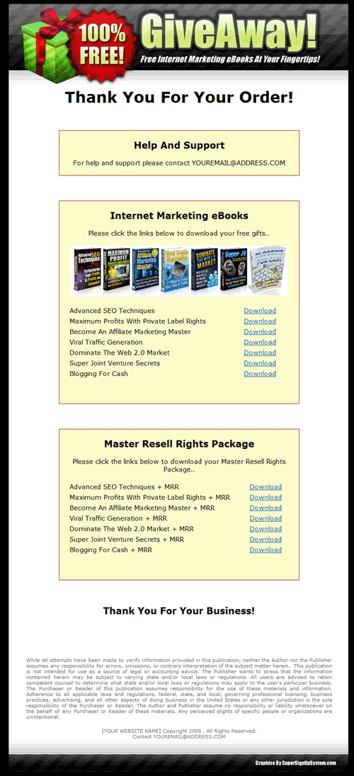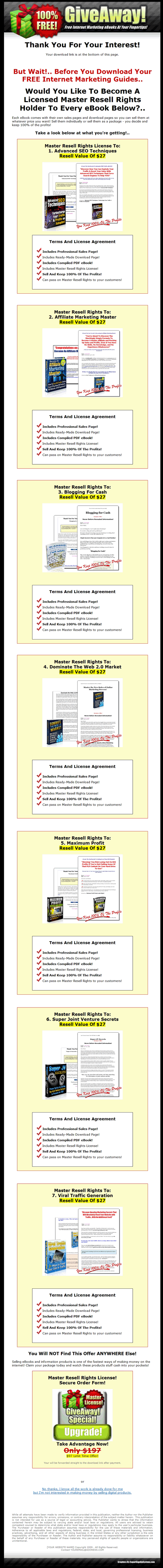 1. An Opt-In Landing Page 2. A Confirmation Page 3. A Download Page 4. A Special Offer Page 5. A Special Offer Download Page 6. All The eBooks And Master Resell Rights Material 7. Extra Bonus! The Quick Start Guide